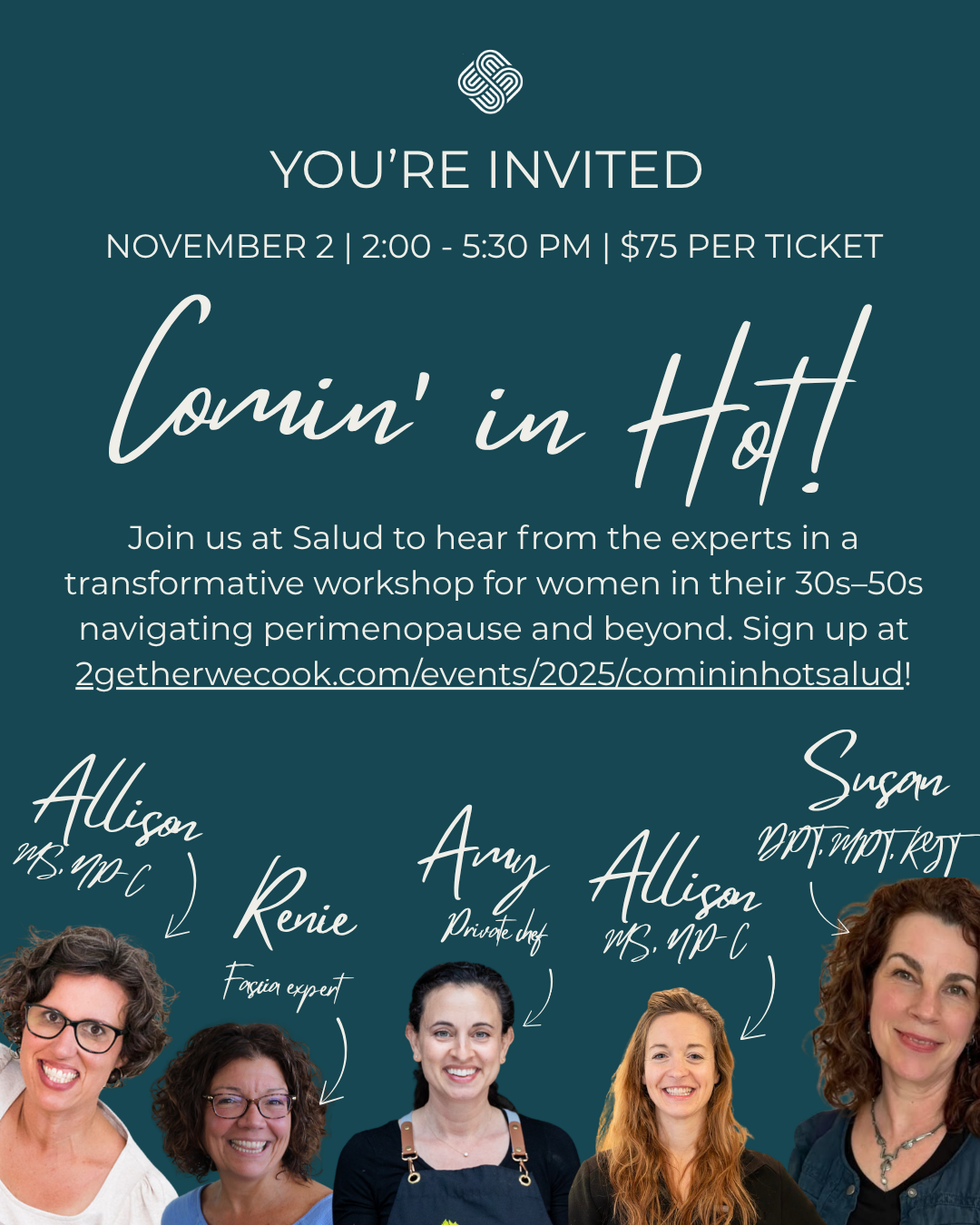 Join us at Salud for a transformative perimenopause workshop led by a team of expert medical, movement, and food specialists—where nutrition, hormonal health, and physical well-being come together in one empowering experience for your middle-aged self. Discover practical tools, personalized support, and delicious food to help you thrive through the Comin’ in Hot years.